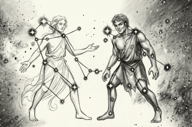 «Castor y Pollux, los Dioscuros, representan la dualidad esencial del alma humana: lo mortal y lo divino, lo terrenal y lo celestial, unidos en un vínculo que trasciende la muerte.»